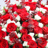 This stunning bouquet is a celebration of passion and devotion, an embodiment of love that speaks louder than words. The radiant red roses fill the white box, their beauty amplified by the delicate baby roses that add a soft, romantic touch. Two stems of Eucalyptus lend a fragrant depth to the arrangement, while the bold red ribbon ties everything together with elegance. This gift is a grand gesture for moments when you want to express how deeply you feel, offering an unforgettable experience that will bloom forever in the heart.
