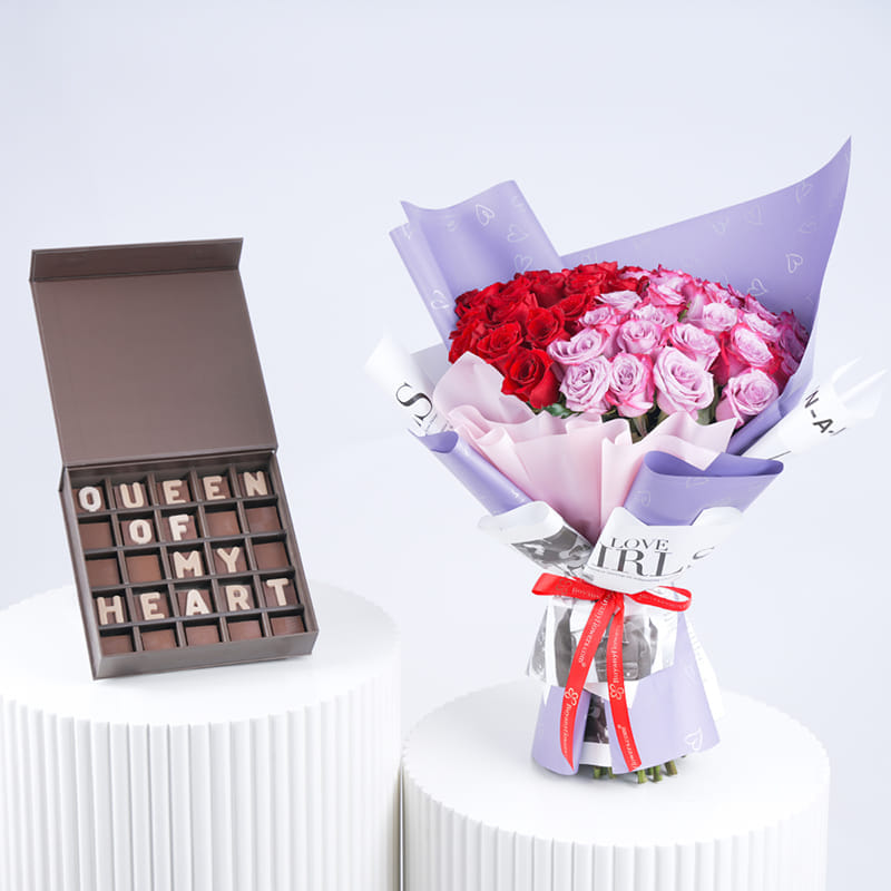 Make your loved one feel on cloud nine with this arrangement of Roses Bouquet with Chocolate. This stunning bouquet includes 26 purple and 25 red roses, wrapped in purple and pink heart-themed paper and tied with a red ribbon. Paired with Sweecho "Queen of my Heart" chocolates, this gift is a perfect way to express your deep affection. Ideal for Valentine’s Day, anniversaries, or any special occasion, it’s a grand and thoughtful gesture that will leave a lasting impression of love and care.