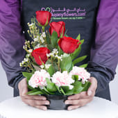 A beautiful gesture that speaks from the heart, this arrangement is a symphony of love and tenderness. Red roses, with their passionate beauty, blend effortlessly with the soft, delicate pink carnations, while the wax stem and ruscus add layers of elegance and depth. Carefully arranged in a sleek black ceramic vase, this stunning creation embodies the quiet elegance of affection. It's a heartfelt expression of love, a gift designed to create memories that will last long after the petals have fallen. Perfect for marking a special moment, it's the kind of gift that lingers in the heart.
