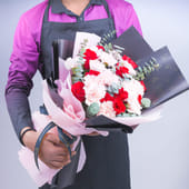 Unveil the essence of romance with this captivating bouquet, where red roses and soft pink carnations come together in a beautiful harmony. The gentle parvifolia adds a touch of elegance, perfectly complementing the vivid blooms. Wrapped in sleek black and soft pink paper, the bouquet is finished with a delicate ribbon, creating an air of sophistication and grace. Whether it's for a special occasion like Valentine’s Day or just to express your love, this enchanting arrangement speaks volumes! It is the perfect gesture to make your beloved feel cared for and valued.