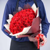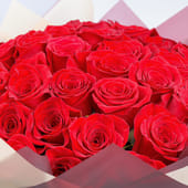 This elegant bouquet of 51 red roses is beautifully wrapped in a blend of brown marble and beige paper, tied with a bold red ribbon. The rich hues against the soft wrapping create a striking, sophisticated look that conveys deep affection. Perfect for Valentine’s Day or any special occasion, this arrangement is designed to captivate and leave a lasting impression. A truly romantic gesture that’s sure to make your partner feel cherished and adored, adding a touch of luxury to any moment.