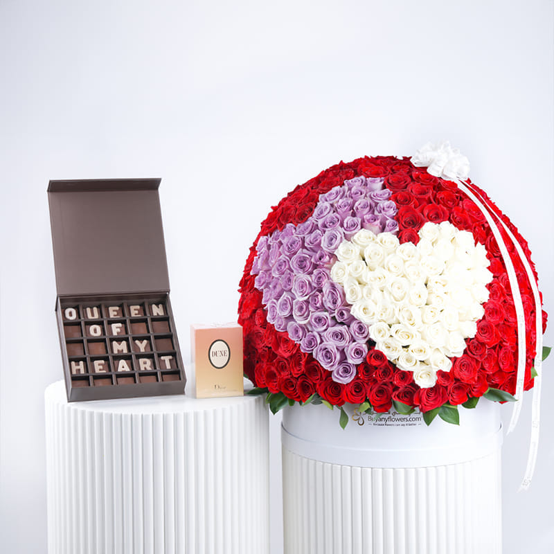 Indulge in this grand expression of love, featuring red roses, purple roses, and white roses, arranged in a heart shape that symbolises deep passion and admiration. The bouquet is elegantly placed in a white box, finished with a soft white ribbon. Complemented by stems of ruscus for added freshness, this magnificent arrangement is paired with a 'Queen of My Heart' chocolate box and a luxurious Dior perfume. Perfect for occasions like Anniversaries, Valentine’s Day, or for just because moments, this gift is a stunning fusion of love, luxury, and romance.