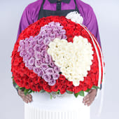 Immerse yourself in the grandeur of love with this stunning flower arrangement. Featuring purple roses, symbolising enchantment, and white roses, representing purity, this bouquet is a true masterpiece. At its heart, vibrant red roses convey deep passion and affection, beautifully arranged in a white box and finished with a soft white ribbon. The addition of stems of ruscus enhances the bouquet's lush, elegant design. Perfect for occasions like Anniversaries, Valentine’s Day, or for just because moments, this arrangement makes an unforgettable romantic gesture.