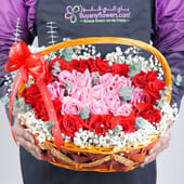 Nestled within a charming brown basket, this romantic arrangement combines red and soft pink roses, each carefully placed to express heartfelt emotions. Surrounded by delicate ruscus and gypso, the flowers form a natural harmony, while the red ribbon bow adds a touch of elegance and love. Perfect for Valentine’s Day or special moments, this beautiful gift speaks the language of affection and romance. It is a heartfelt gesture designed to leave a lasting impression.