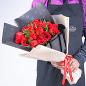 Immerse your loved one in the beauty of this elegant floral arrangement. Featuring 21 vibrant red roses, each symbolising deep love and affection, this bouquet is beautifully wrapped in heart-shaped black special paper, with a delicate milky tea sheet and finished with a bold red ribbon. Complemented by the charming Songs of Jamaica leaves, this exquisite design is perfect for celebrating romance and connection on occasions like Anniversaries, Valentine’s Day, or for just because moments. A thoughtful, artistic gift that conveys your love with timeless elegance and grace.