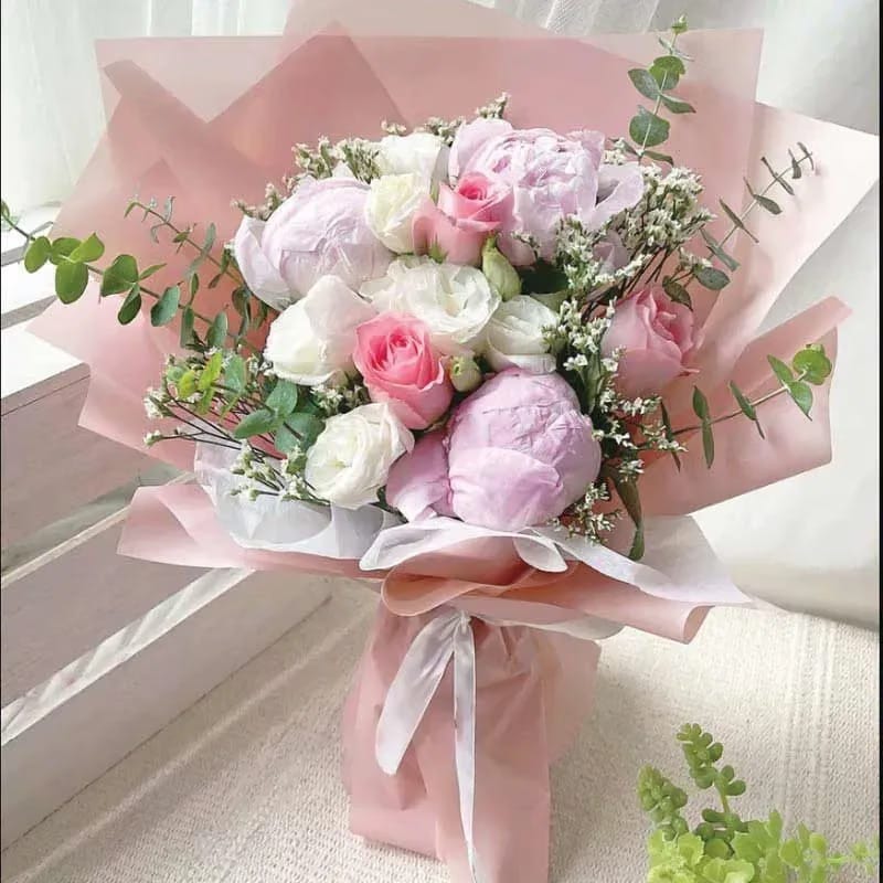 An enchanting mix of soft hues, this bouquet captures romance in its purest form. Blushing pink peonies blend with roses in shades of white and pink, while delicate baby roses add a sweet finishing touch. Eucalyptus and white limonium bring texture and depth, creating a look that is graceful and timeless. Wrapped in pastel-toned paper and tied with a flowing ribbon, it feels like poetry in floral form. Perfect for anniversaries, proposals, or heartfelt surprises, this bouquet radiates elegance, affection, and the quiet beauty of love.