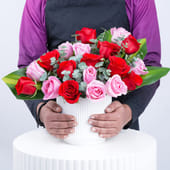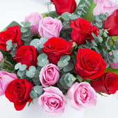 Bring warmth and love into any space with this stunning floral arrangement. The rich red and soft pink roses, paired with fresh eucalyptus and dracaena massangeana leaves, create a beautiful contrast that captures the essence of romance. Arranged thoughtfully in a sleek white ceramic pot, this bouquet exudes elegance and charm. Whether it’s for a romantic gesture or to celebrate a special occasion, this timeless display of love is sure to leave a lasting impression.