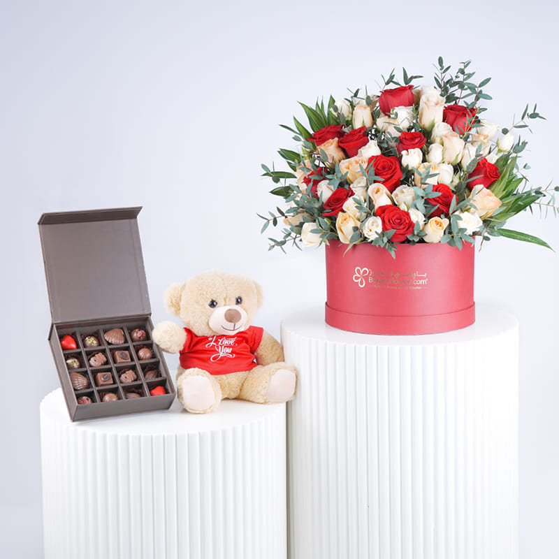 A perfect gift for those who deserve to feel truly adored, this arrangement speaks directly to the heart. The rich red roses echo the depth of passion, while the soft white and peach roses add layers of grace and tenderness. Song of Jamaica leaves and Parvifolia offer a natural elegance, creating a beautiful balance. Arranged in a striking red box, this romantic gesture is completed with premium assorted chocolates and a cuddly ‘I Love You’ teddy. Together, these elements make a gift that’s as sweet and thoughtful as your love, designed to create lasting memories.