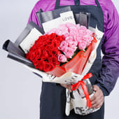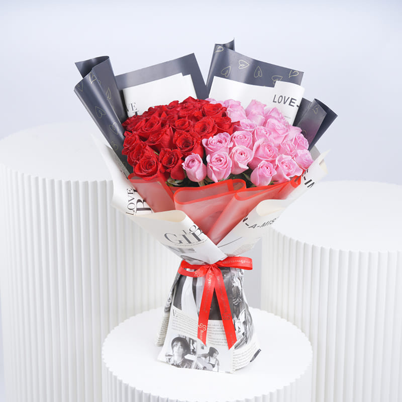 Celebrate your love with this heartfelt Roses Bouquet, a magnificent arrangement of 26 pink and 25 red roses wrapped in white newsprint paper. The bouquet is beautifully accented with black and red heart wrapping and tied with a bold red ribbon. This gift is ideal for expressing your feelings on Valentine’s Day, anniversaries, or any romantic occasion. The thoughtful combination of roses and heart-themed details makes this bouquet a timeless expression of affection and admiration, sure to leave a lasting impression on your loved one.