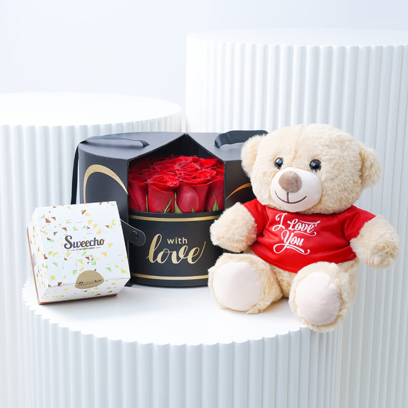 A truly special gift, this beautifully designed black box contains 19-21 striking red roses, symbolizing love and passion. Paired with a soft "I Love You" teddy bear and a 250g box of Sweecho premium chocolates, this gift is sure to leave a lasting impression. Whether it’s for a romantic celebration or a Valentine's Day surprise just to say “I care,” this delightful trio of roses, chocolates, and cuddles will make your loved one feel deeply cherished and adored.