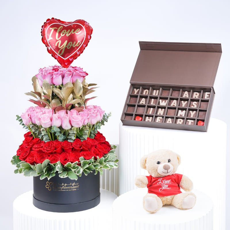 This bouquet is an unforgettable expression of love. A magnificent bouquet of roses in captivating shades, arranged with elegance and grace, is perfectly complemented by lush greenery. Topped with a gleaming “I Love You” foil balloon, this arrangement speaks directly to the heart. Alongside a charming "You Are Always in My Heart" Sweecho chocolate, the sweet sentiment, and a teddy bear adds warmth and comfort, making it the perfect companion for those you hold dear. A true celebration of love, tenderness, and unforgettable moments.