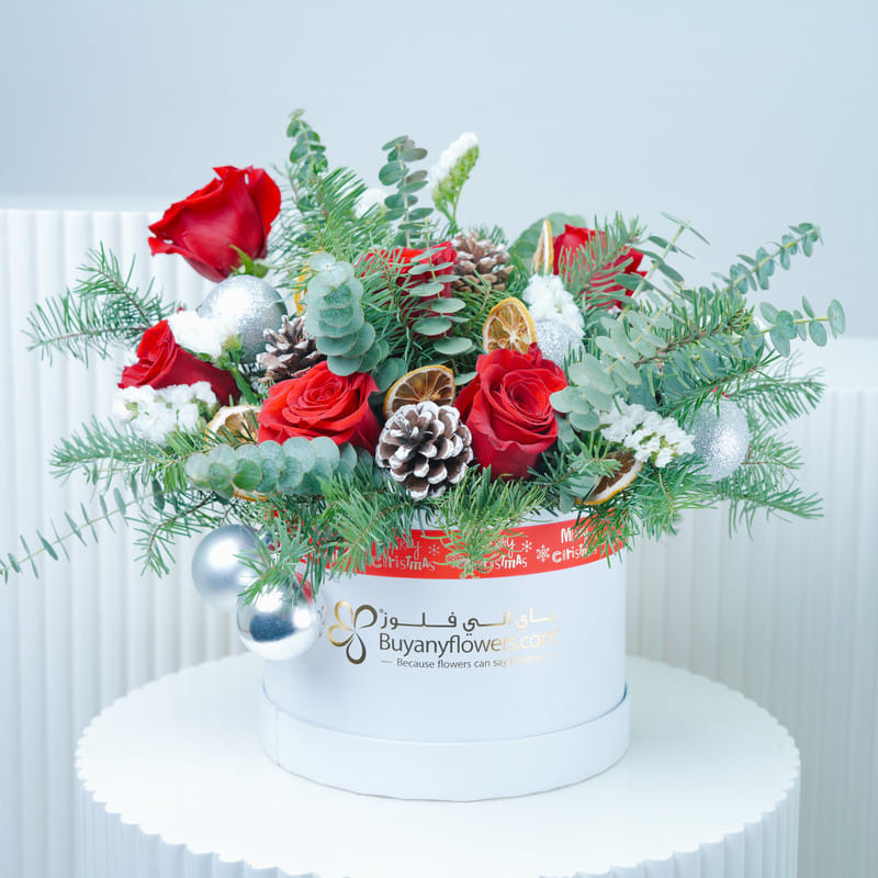 Celebrate the holiday season with this beautiful festive arrangement, designed to bring warmth & elegance to Christmas gifting. It pairs six red roses with delicate white statice, creating a stunning contrast against fresh eucalyptus and nobilis leaves. Pine cones and dried orange slices add a cosy, seasonal charm, while silver baubles bring a subtle festive shimmer. Neatly arranged in a sturdy white box, it looks refined and thoughtfully put together. This arrangement makes a lovely Christmas gift for family, friends, or colleagues, perfect for spreading cheer and creating memorable moments.