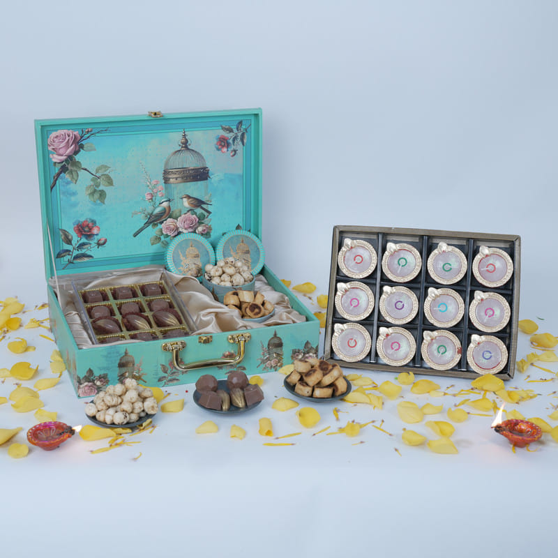 A festive curation that blends taste, tradition, and light, this hamper is designed to make every celebration memorable. Relish the indulgence of assorted Sweecho chocolates, the savoury crunch of Bhakhar Badi, and the spiced delight of Masala Makhana. To complete the ensemble, 12 elegant clay Diyas are included, ready to brighten homes with their warm glow. Beautifully presented in a premium floral-illustrated box, this hamper is both a treat for the senses and a symbol of festive charm, making it a perfect gift for loved ones.