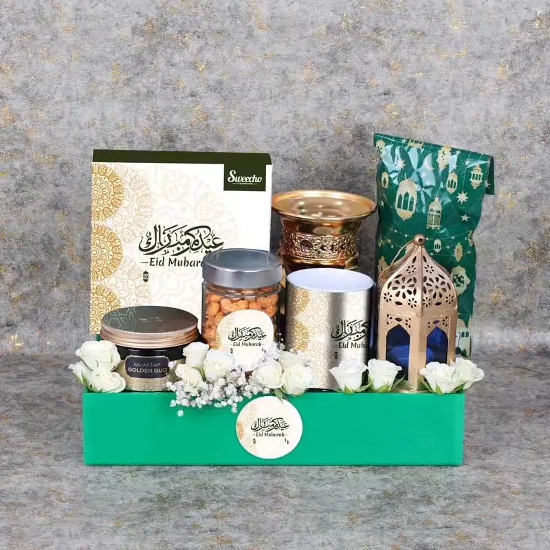 Eid’s spirit is captured beautifully in this elegant hamper. The stuffed dates by Sweecho offer a burst of natural sweetness, complemented by indulgent assorted chocolates for a rich treat. The bold aroma of Arabic coffee, best enjoyed in the stylish Eid mug, brings warmth to every gathering, while crunchy chilli cashews add a savoury balance. A Swiss Arabia Bakhoor with a golden burner fills the home with a luxurious fragrance, and a classic lantern enhances the festive glow. Perfectly arranged, this hamper is a complete blend of taste, tradition, and celebration for your loved ones.