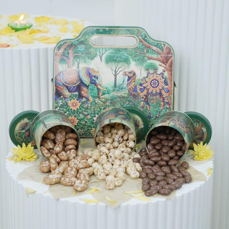 An artistic hamper that combines gourmet delights with cultural elegance, this box is a true festive showstopper. Overflowing with indulgent chocolate-coated almonds, crunchy masala makhana, and perfectly caramelised pecans, it offers a balance of taste, health, and richness. The beautifully illustrated keepsake box, adorned with majestic elephants and peacocks, adds a touch of heritage charm to the gifting experience. Whether shared with family or presented to loved ones, this hamper carries the spirit of celebration, making every occasion memorable and full of flavour.