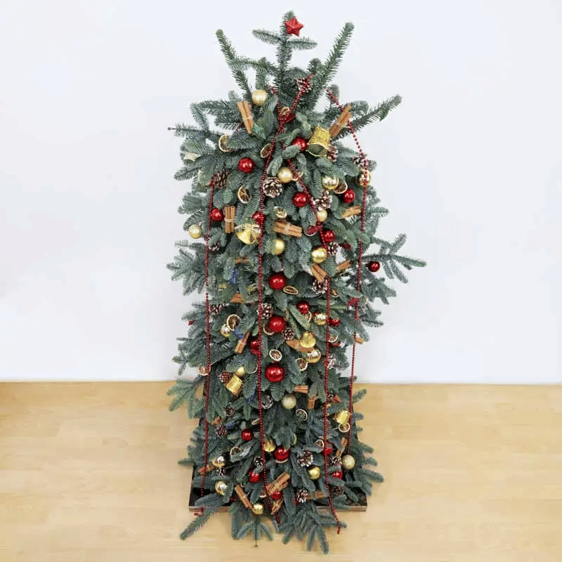Step into the season with this striking red-themed Christmas tree arrangement designed to make any corner feel festive. Fresh nobilis stems are shaped into a whole, elegant structure, dotted with golden and red baubles, pine cones, dried lemon slices, and charming Christmas ornaments. Cinnamon sticks add a warm touch, while red beard hangings bring playful movement. Styled on a sturdy wooden stand with oasis for lasting freshness, this arrangement makes a thoughtful Christmas gift or a beautiful statement piece for your own home.