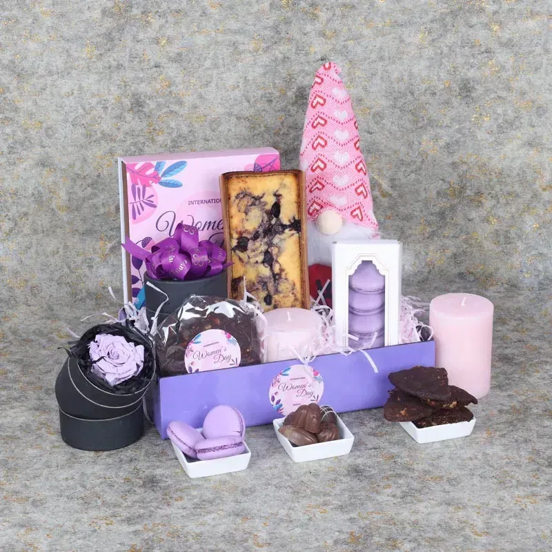 Celebrate the extraordinary women in your life with a hamper that’s as thoughtful as it is delightful. This Women’s Day special includes a purple forever rose in a chic black box, indulgent premium assorted chocolates, a soft toy, a freshly baked blueberry loaf cake, and delicate blueberry macarons. Adding more sweetness is a large chocolate cookie, paired with the soothing glow of a scented pillar candle. Elegantly arranged in a purple acrylic tray, this hamper is a heartfelt expression of love, appreciation, and admiration.