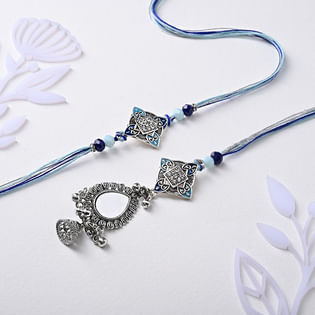 Blue Mirror Work Couple Rakhi Set-USA