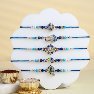 Five Blue N Silver Rakhis With Sweets N Almonds